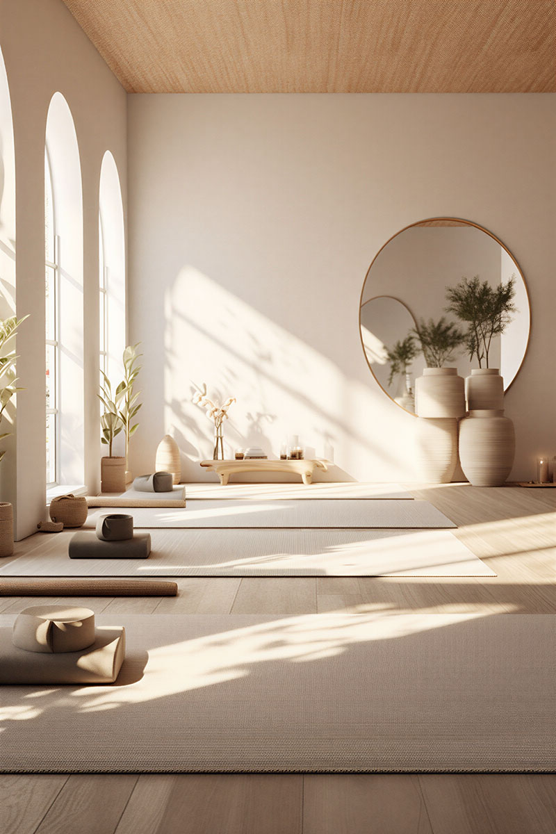 Warm wood flooring and soft lighting create a soothing, balanced environment