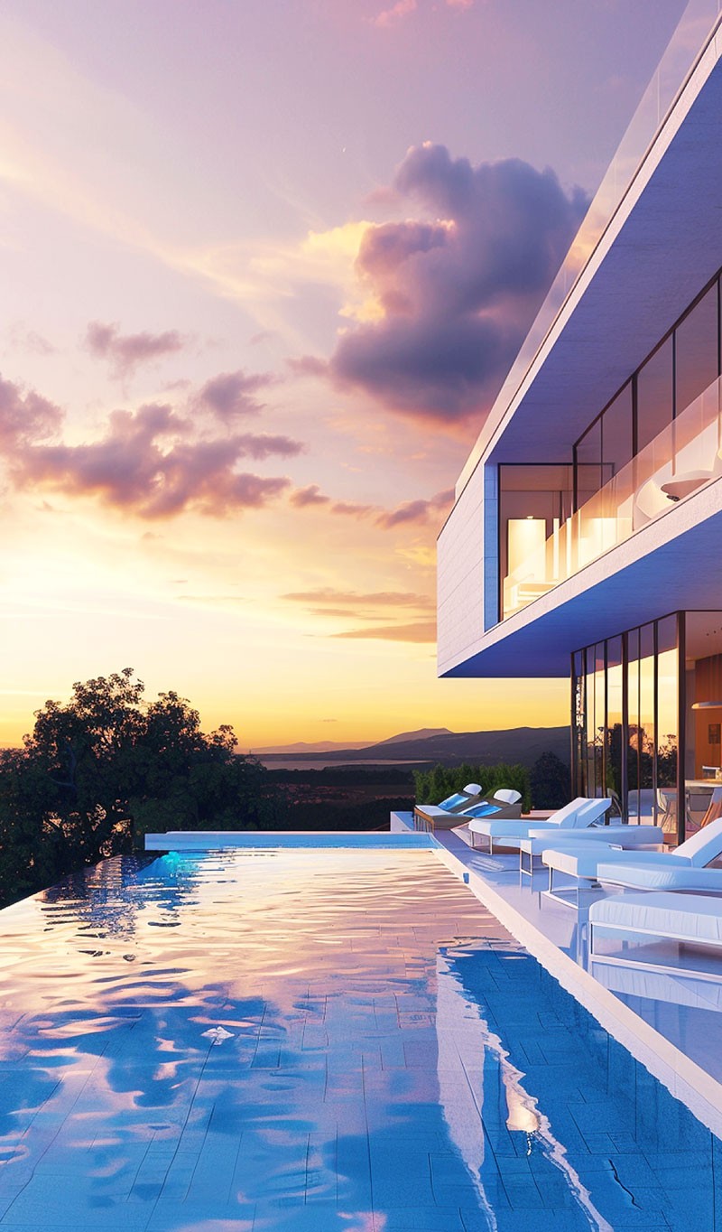 Ambient nighttime lighting transforms the pool into a luxurious retreat setting